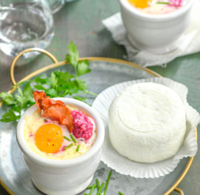 Œuf cocotte au chèvre frais & chips lardées