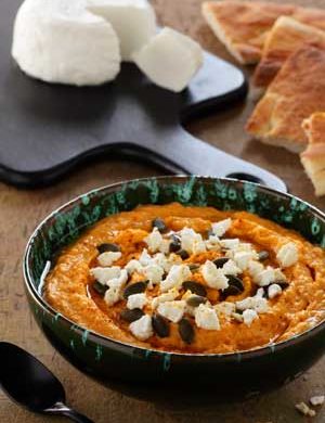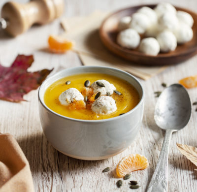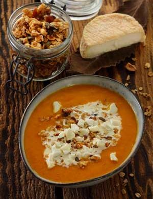 Granola sur soupe de potiron et de carotte aux brisures de Mothais sur feuille