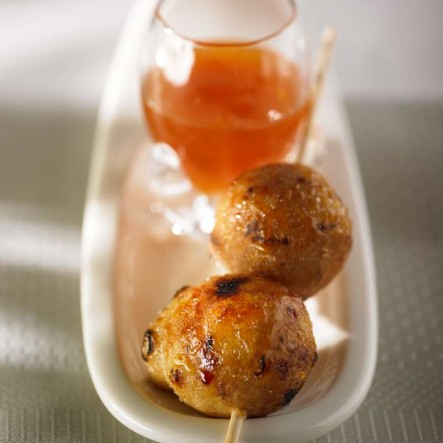 La cuisson des beignets : préchauffez la friteuse à 170 °C et le four à 180 °C. Sortez les boules de crème au chèvre congelées et démoulez-les. Trempez-les dans la pâte à beignets à l'aide de la fourchette. Plongez-les ensuite dans la friteuse environ 45 secondes pour obtenir des beignets bien blonds. Egouttez-les sur du papier absorbant. Passez-les au four pendant 1 minute. Roulez-les aussitôt dans le sucre semoule et embrochez deux beignets trempés dans la confiture d'abricots citronnée.