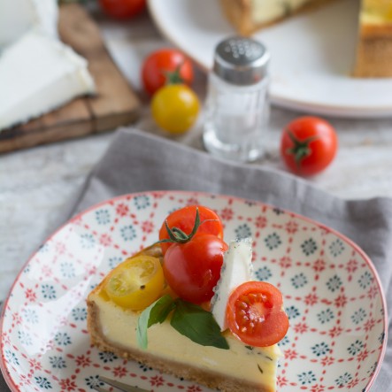 Cheesecake salé au Valençay, tomates cerises et basilic