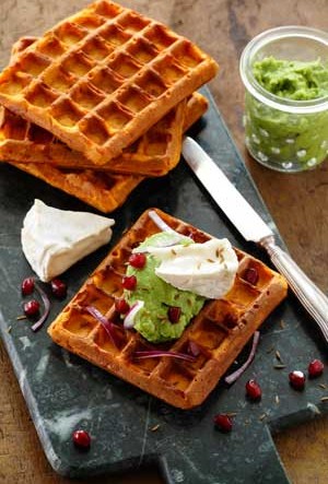 Déposer les gaufres dans une assiette, ajouter de l’écrasé d’avocat en quenelles et de l’oignon rouge. Disposer les portions de chèvre-boîte et terminer avec les graines de grenade et de cumin. Déguster.